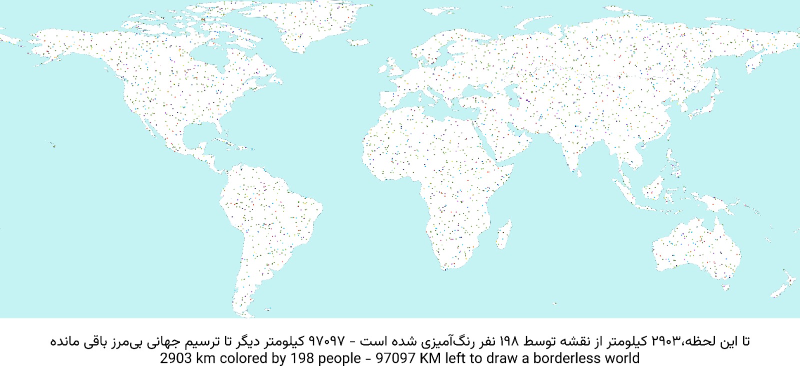 این نقشه تقسیم شده به صد هزار قسمت مساوی، هر کسی که در خرید کیلومترهای سفرهمراهی کنه ، به تعداد اون کیلومترها میتونه قسمتی از این صد هزار قسمت رو به رنگی که دوست داره رنگ کنه. اون رنگها به صورت کاملا اتفاقی توزیع خواهند شد و در نهایت با نقشه ای از زمین روبرو خواهیم شد که به صورت کاملا اتفاقی رنگ خواهد گرفت